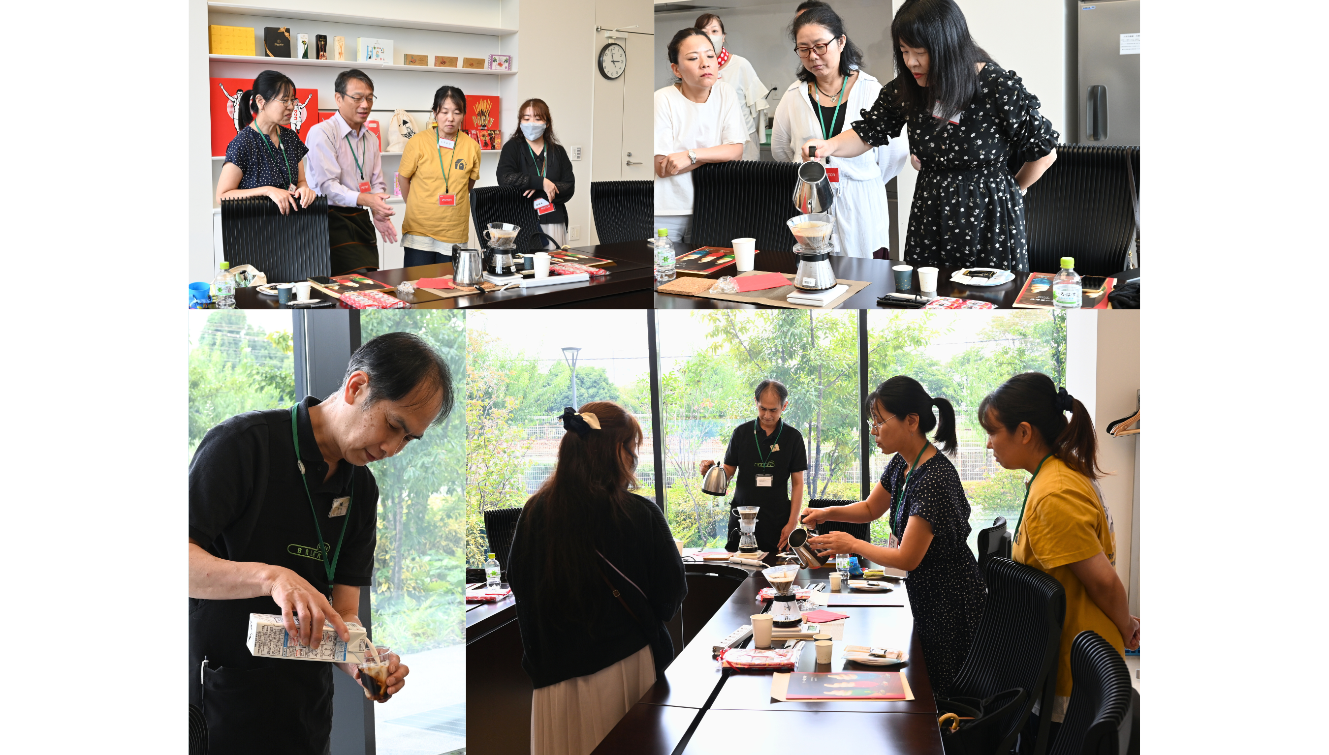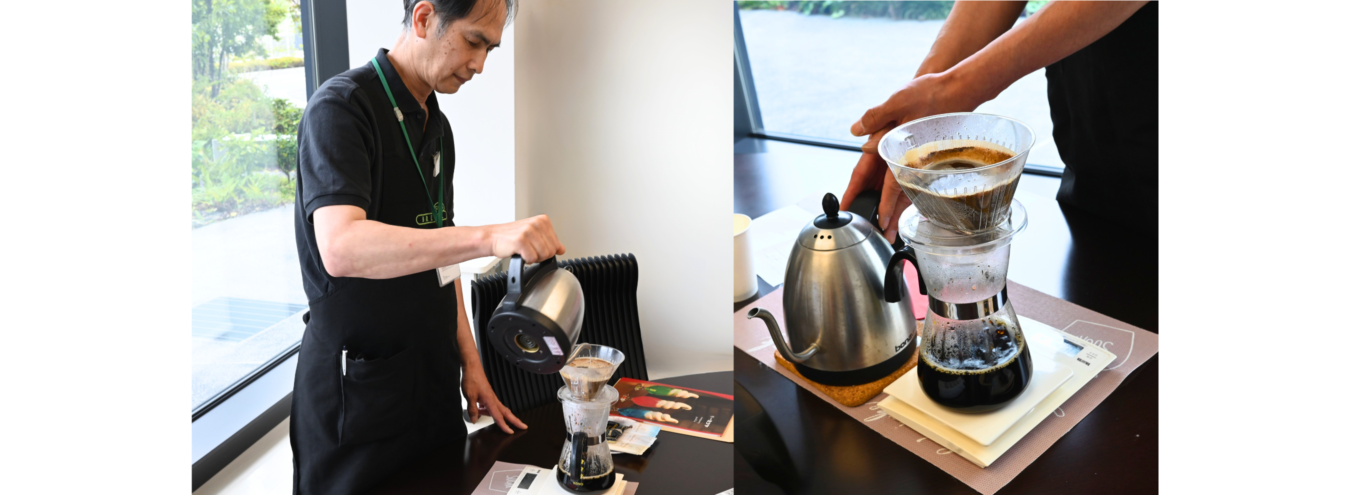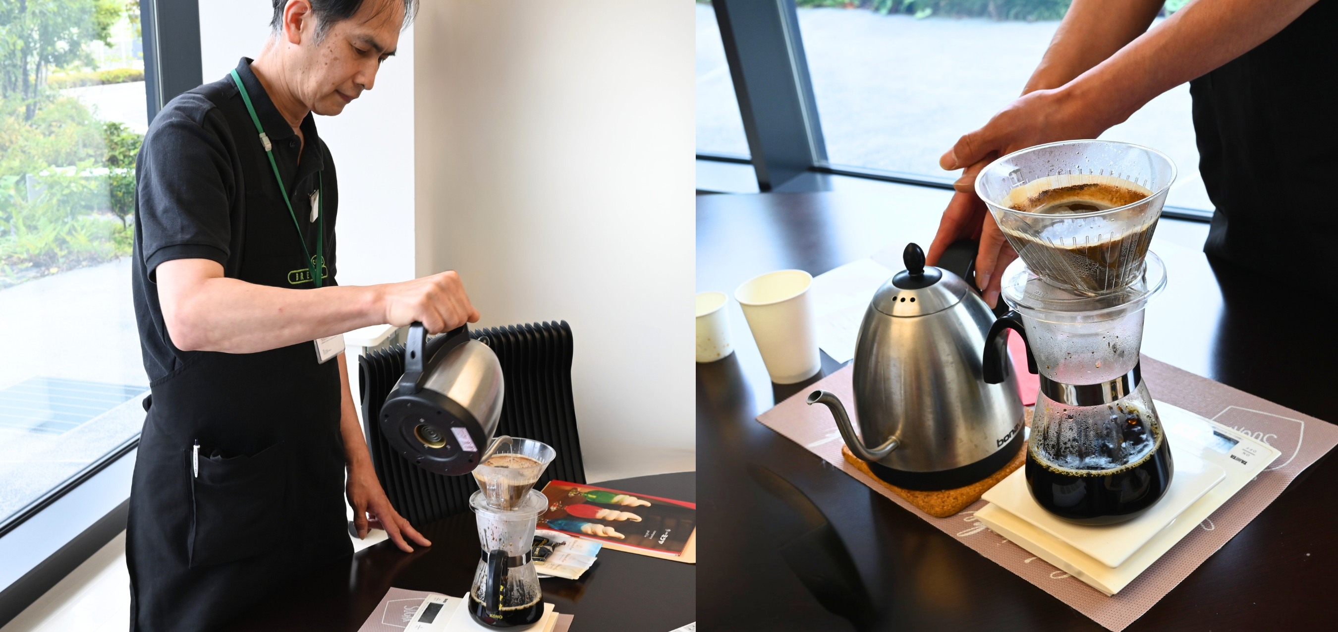 レクチャーの後、参加者も実際にハンドドリップに挑戦。皆さん真剣に取り組んでいただき、会場にはコーヒーの良い香りが広がります。