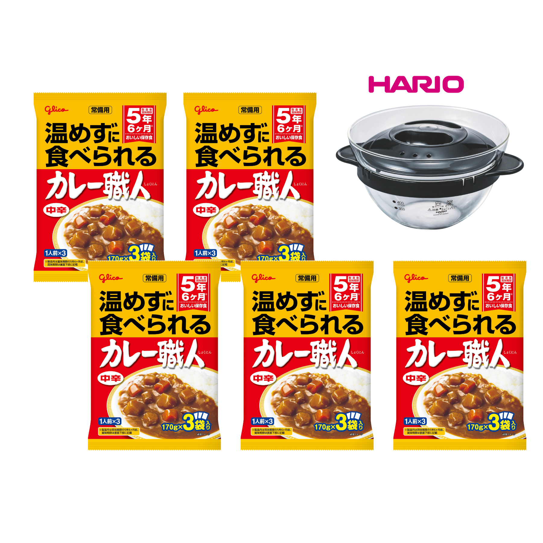 【詰合せ内容】常備用カレー職人3食パック「中辛」5品(15食)、HARIOレンジ鍋(1人用)1品