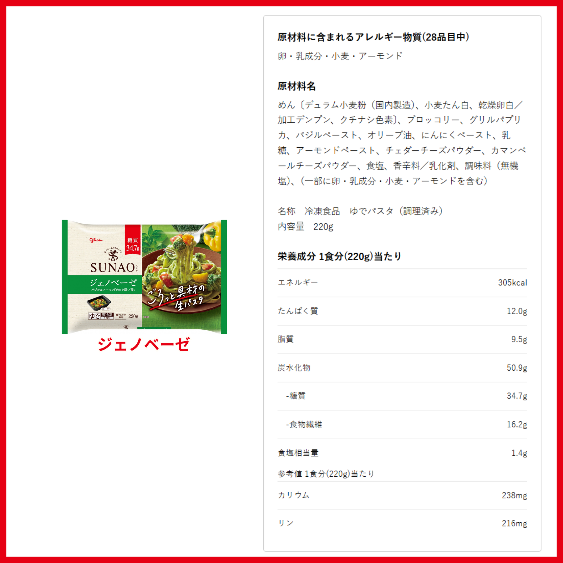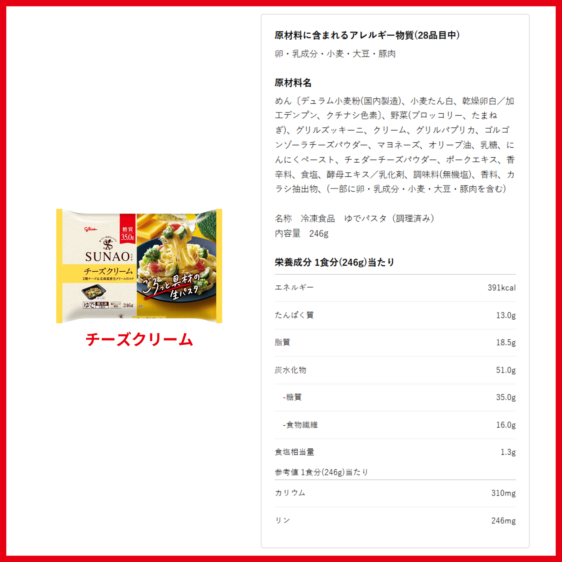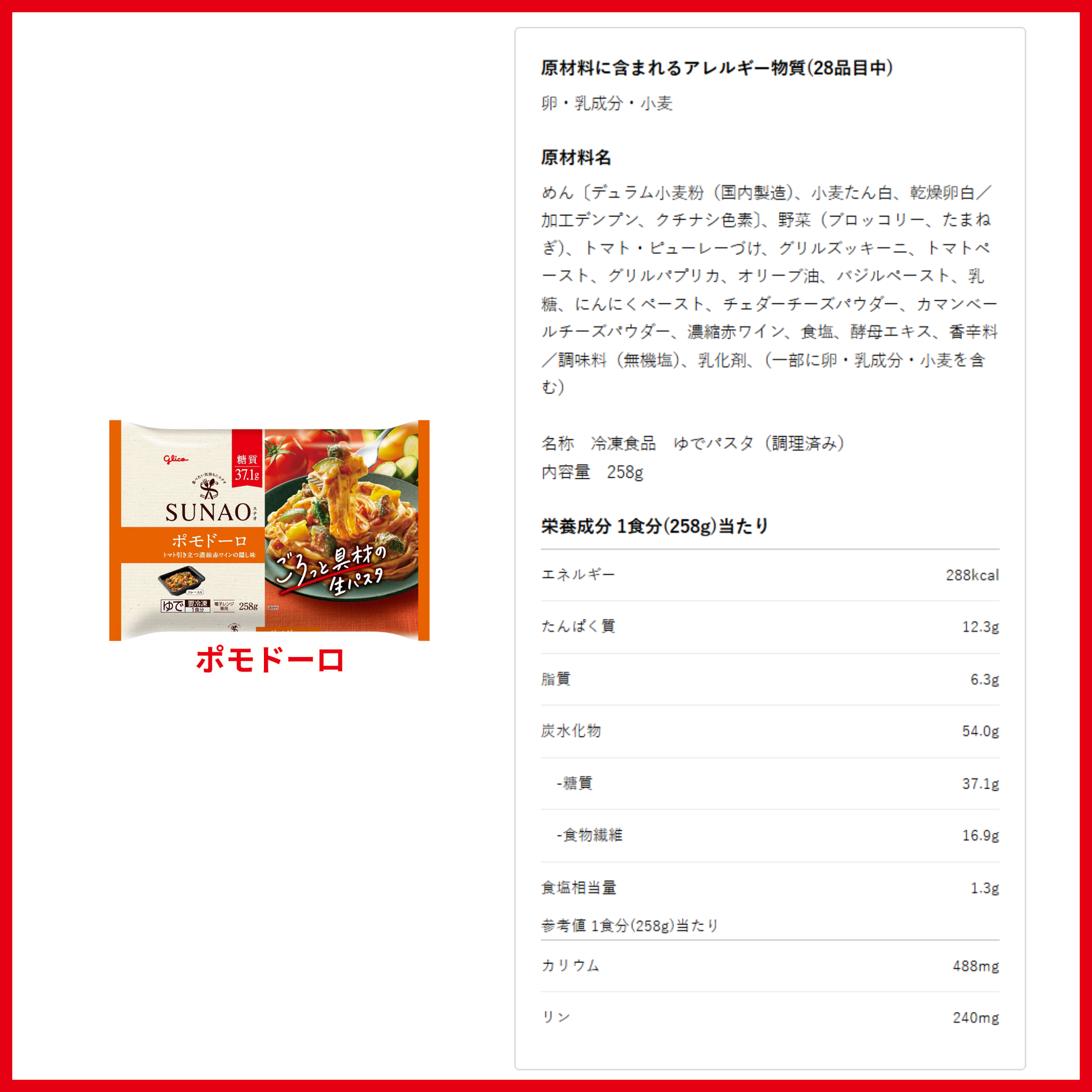 ●ご購入前に以下の内容をご確認ください。・冷凍便でお送りします。・SUNAO生パスタ(冷凍)専用の配送箱に入れてお届けします。・ご注文のキャンセルは承っておりません。あらかじめご了承ください。●原材料名・栄養成分表示こちらご参照ください。(注)お届けする商品とは異なる場合がございます。必ず、お手元の商品パッケージにて原材料名・栄養成分表示のご確認をお願い致します。電子レンジ専用作り方・調理時間は製品パッケージの裏面をご覧ください。※1 「食・楽・健康協会」は、糖質を1食20~40g、間食10g以下にする「適正糖質」を提唱しています。※2 日本食品標準成分表2020年版(八訂)、こむぎ【マカロニ・スパゲッティ類】マカロニ・スパゲッティ ゆでと比較