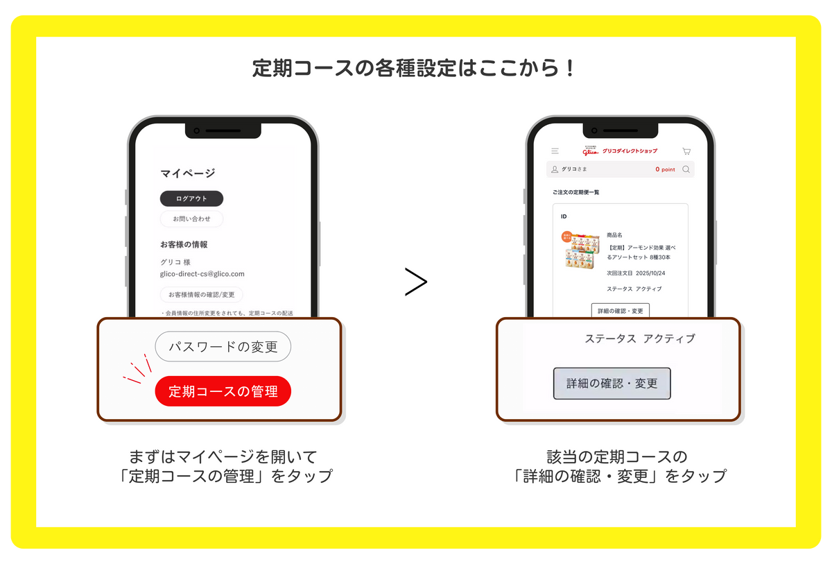 以下の変更をご希望の場合は、ログインいただいたのち、マイページ内の「お客様の情報 お客様情報の確認/変更」をクリックいただくと、Glicoメンバーズの「会員情報変更」ページに遷移いたします。そちらで確認・変更をお願いします。
