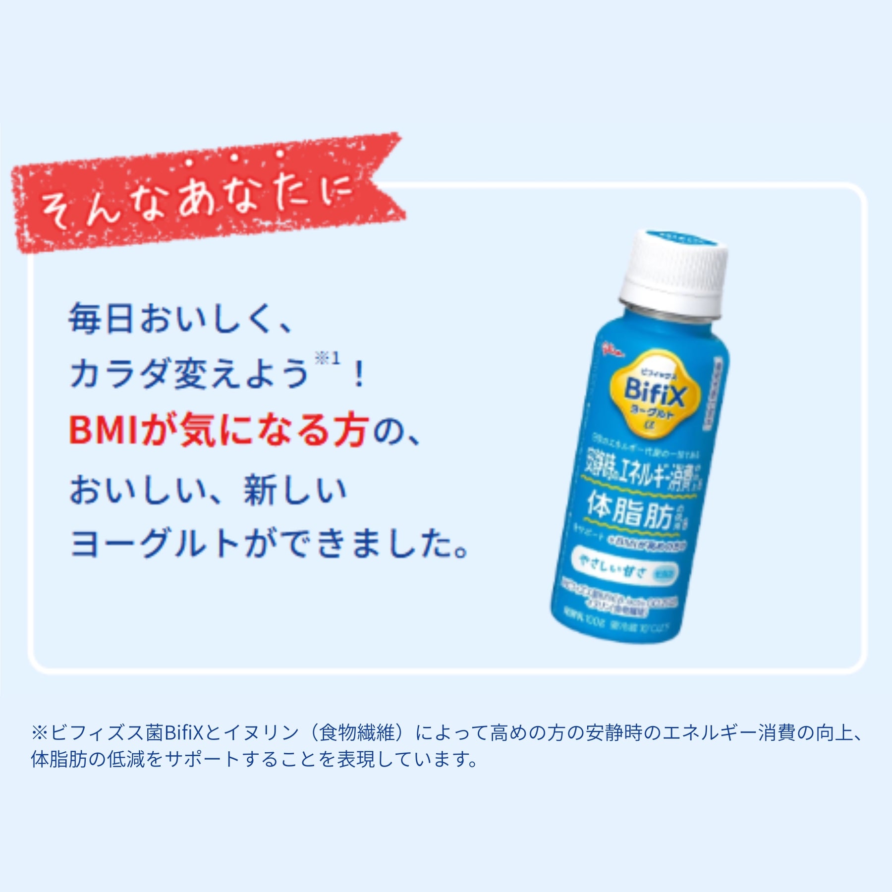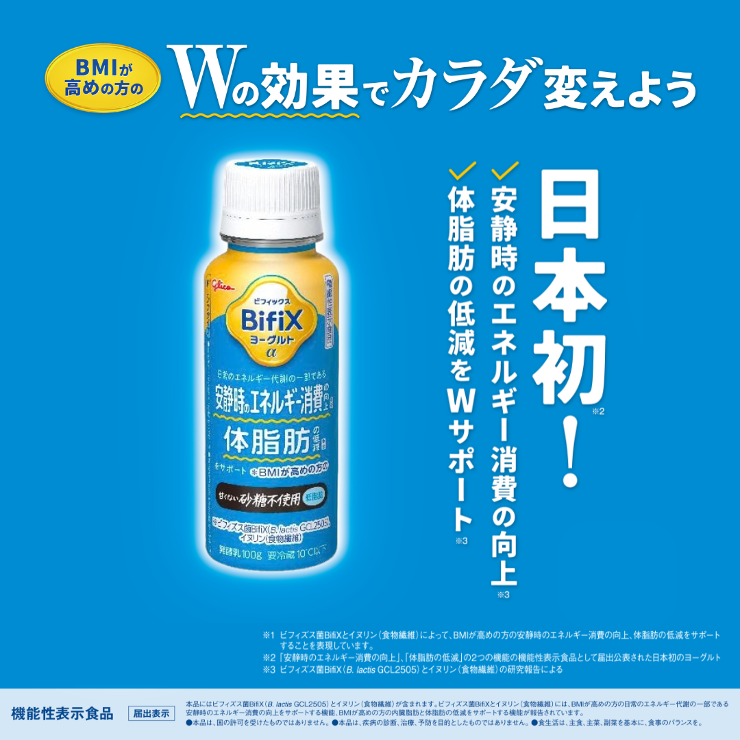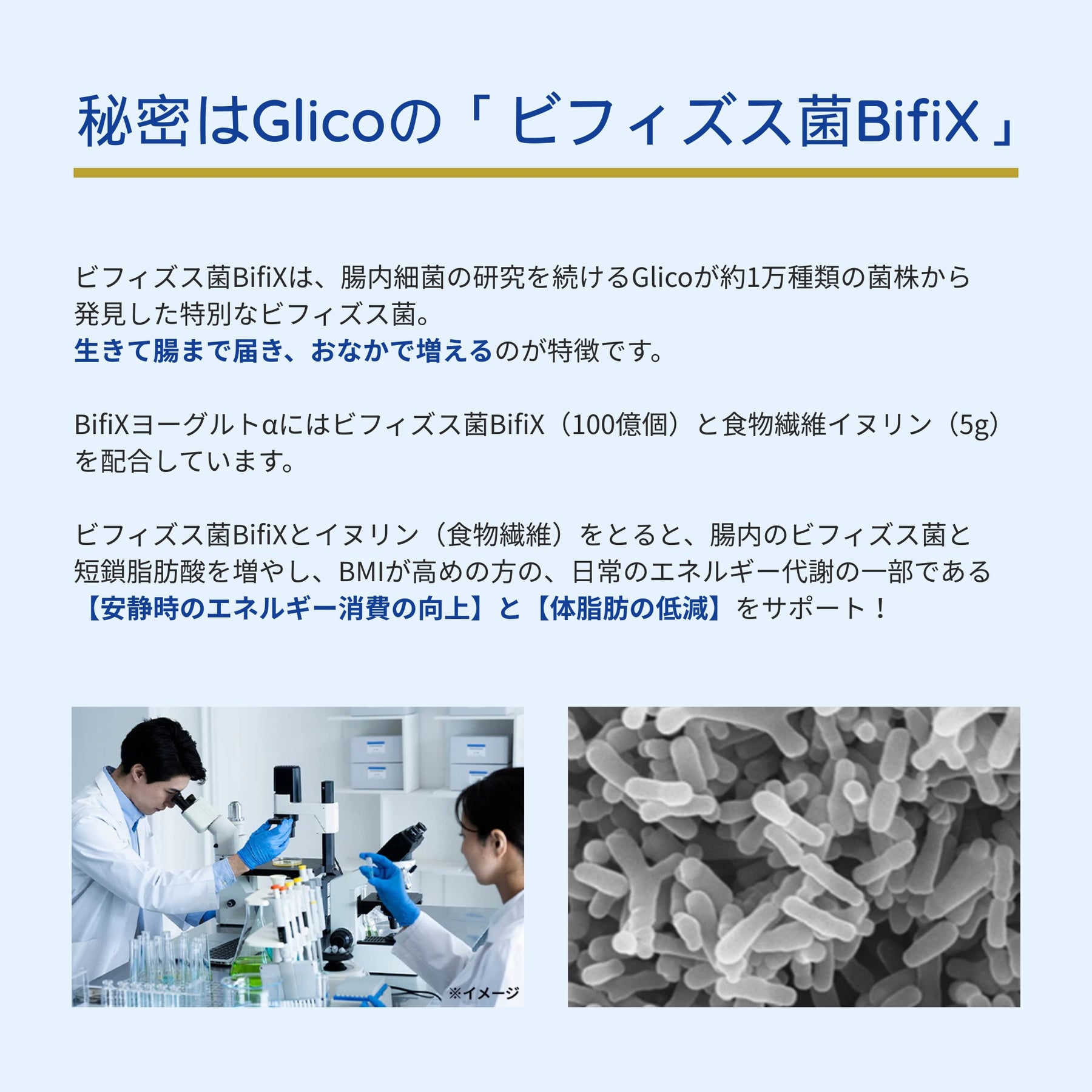こんな方におすすめ!・最近、体脂肪や代謝の低下が気になる・食べることは楽しみたい・激しい運動はつらい・糖質が気になる日本初!※BMIが高めの方の「安静時のエネルギー消費の向上」「体脂肪の低減」をWサポート。BifiXヨーグルトαは、手軽でおいしく毎日に取り入れられてWの効果でカラダを変えたいあなたを応援する【機能性表示食品】です。(届出番号:K375)※「安静時のエネルギー消費の向上」、「体脂肪の低減」の2つの機能の機能性表示食品として届出公表された日本初のヨーグルト。